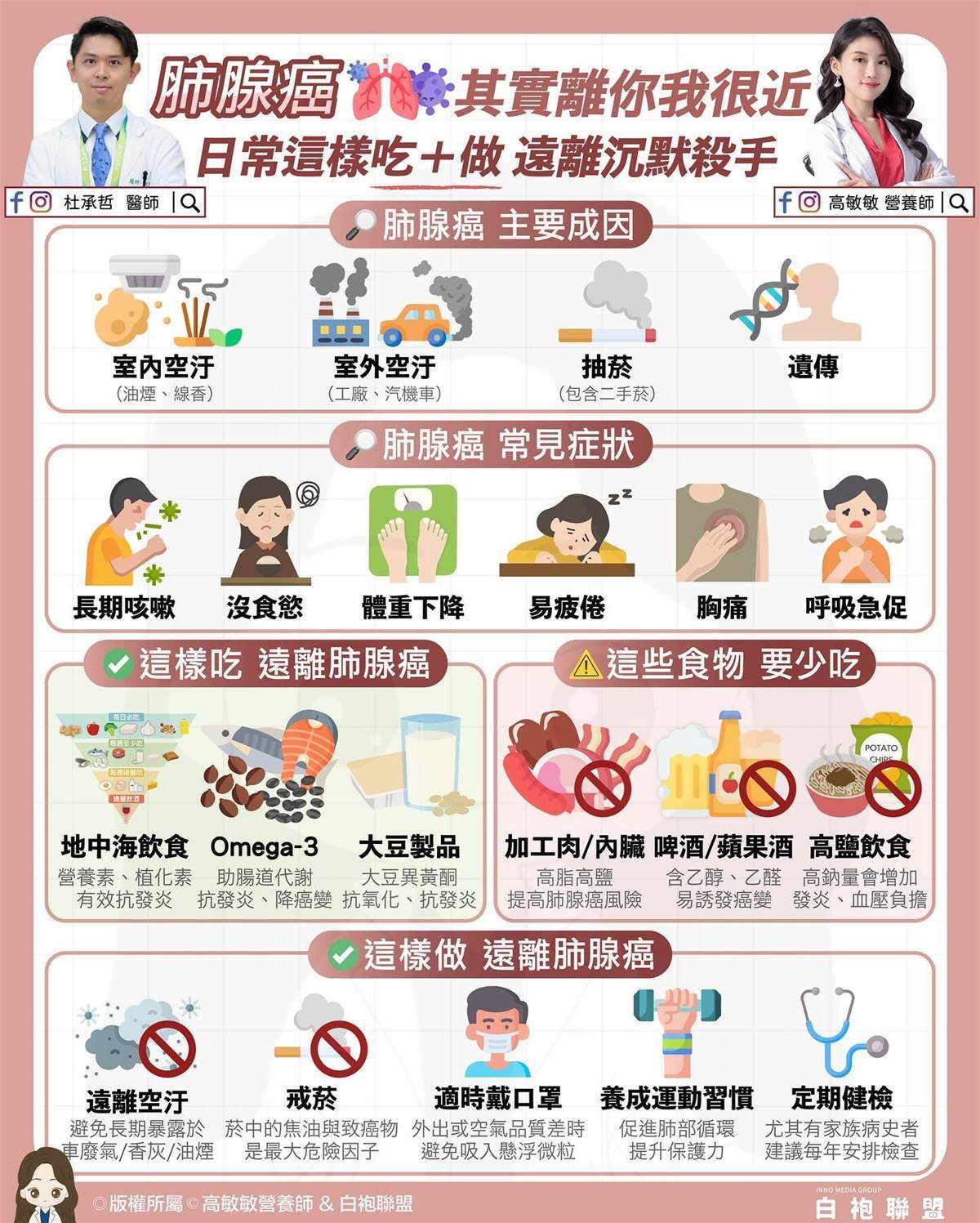 此外,高敏敏呼籲,加工肉品、內臟類應盡量少吃,因其含脂肪與鹽分高,長期攝取會增加肺腺癌與慢性病風險,避免喝啤酒、蘋果酒,內含乙醇、乙醛等高致癌物,容易誘發癌變,也要少吃高鹽飲食,因為攝取過多高鈉恐增加發炎反應與血壓負擔。