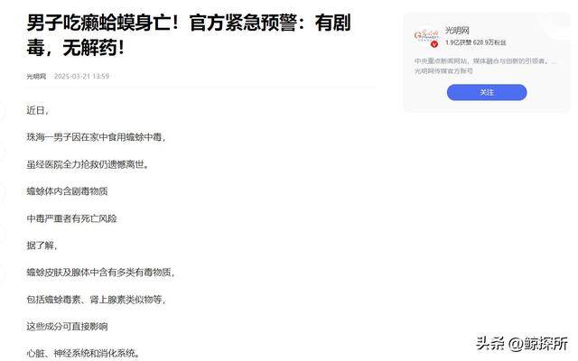 3月底廣州有個男子,就回家吃到了癩蛤蟆,結果直接中毒了,雖然急急忙忙被送到醫院拚了老命救治,但是可惜的是最後還是沒能救回來。