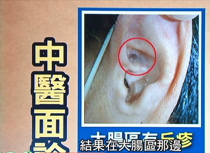 中醫師吳宏乾在《健康2.0》節目中表示,藉由觀察反射區域能夠掌握健康狀況,臉部與耳朵的大腸反射區都能揪出潛在問題。吳醫師分享曾遇過一位前來調養身體的大腸癌患者,他的耳朵大腸區就冒出一顆質地堅硬、體積細小且顏色偏暗的東西,醫師表示要判斷大腸是否有狀況就會檢視此處。